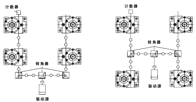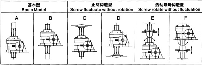 1、基本形式:螺母(蝸輪)轉動絲桿上下移動,此為普通型升降機安裝方式。