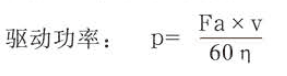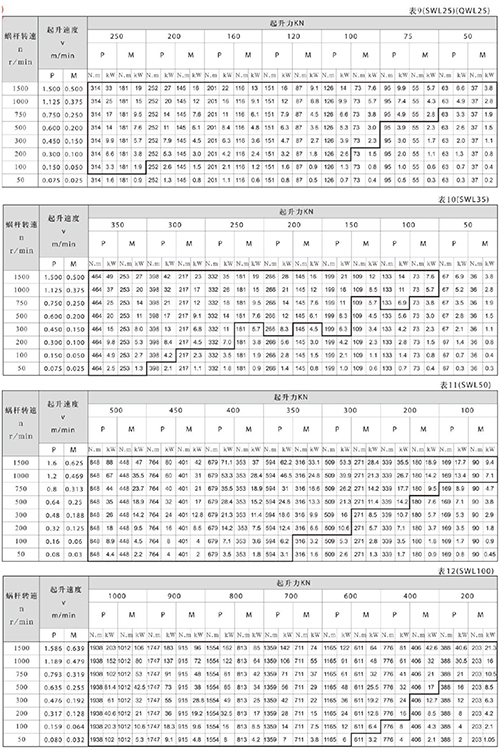 表5~表13是各型號螺桿傳動的許用起升速度、扭矩和功率,其參數適合用于環境溫度為20°C、工作持續率為20%/h或30%/10min的條件下;對粗線范圍內的參數,使用時升降機會產生過熱,應盡量避免選用,否則_采取有效措施。根據螺桿起升負荷及起升速度,按照下列公式計算升降機的驅動功率,再查表5~表13,查出所需升降機型號。
