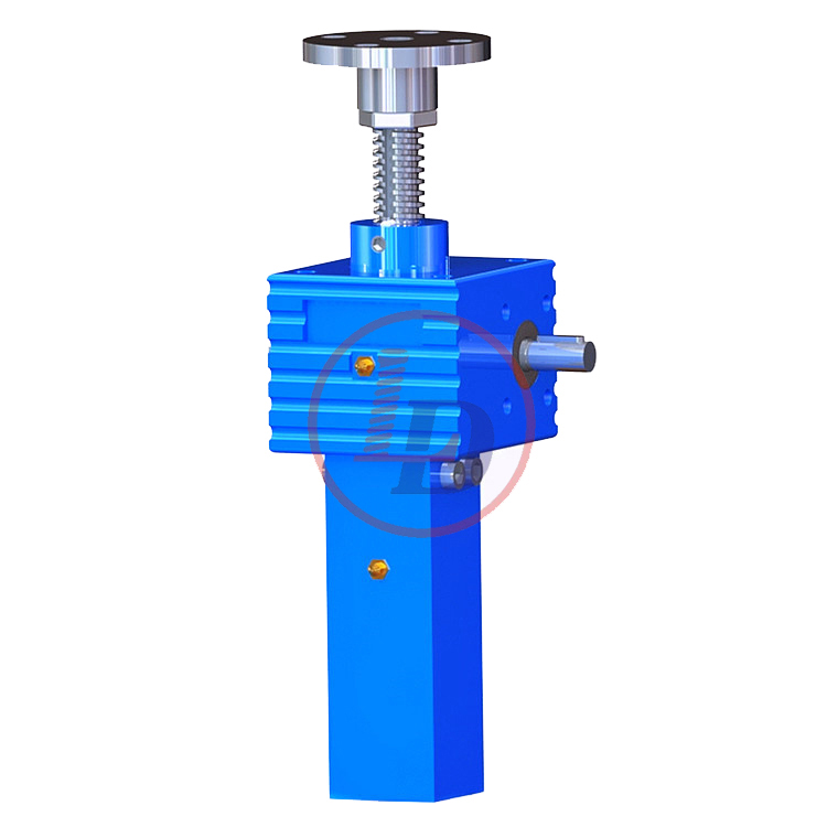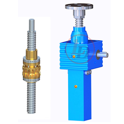 的原理為蝸桿驅動蝸輪旋轉,蝸輪中間為內螺紋孔機構(與絲杠相嚙合),再將旋轉運動傳遞至絲杠上下直線運動。